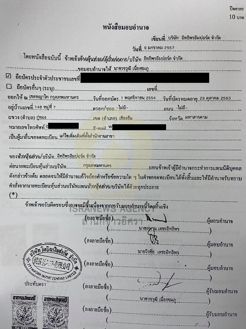 4. เป็น ‘ผู้รับมอบอำนาจ’ ของ บริษัท ยูนิเทค แอสโซซิเอทส์ จำกัด ในการจดทะเบียนแก้ไขเพิ่มเพิ่มเติมวัตถุประสงค์ ต่อนายทะเบียยหุ้นส่วนบริษัท จังหวัดปทุมธานี เมื่อวันที่ 21 มิ.ย.2553