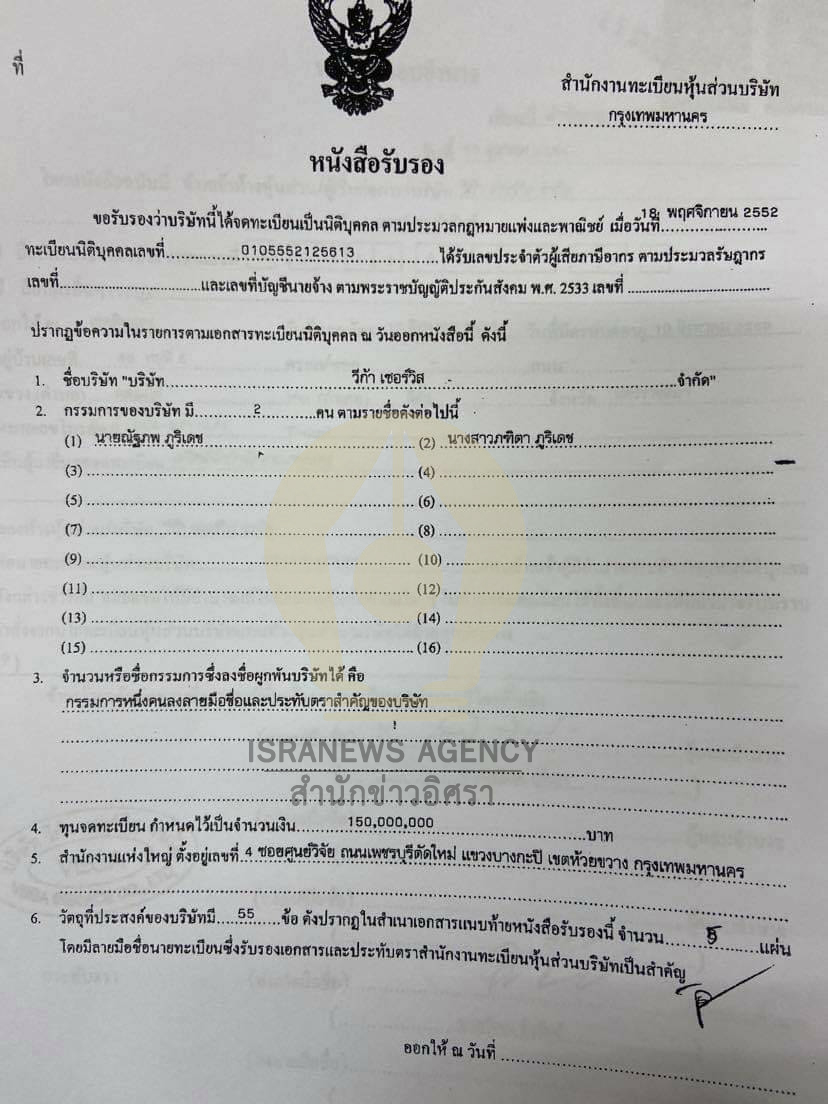 จากการตรวจสอบพบว่า บริษัท วีก้า เซอร์วิส จำกัด จดทะเบียนวันที่ 18 พ.ย. 2552 ทุน 150 ล้านบาท ประกอบกิจการ ซื้อขายให้เช่าสังหาริมทรัพย์ ประเภทรถยก รถกระเช้าตัดกิ่งไม้ ที่ตั้งเลขที่ 168/73 ถ.นาคนิวาส แขวงลาดพร้าว เขตลาดพร้าว กรุงเทพฯ นายณัฐภพ ภูริเดช ถือหุ้นใหญ่ 149,997 หุ้น จากทั้งหมด 150,000 หุ้นมูลค่าหุ้นละ 1,000 บาท มีนายณัฐภพ ภูริเดช น.ส.ภฑิตา ภูริเดช เป็นกรรมการ