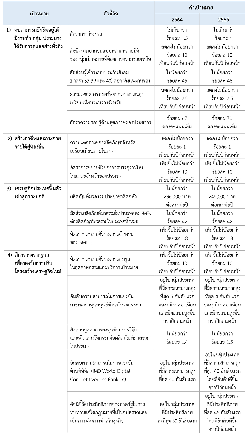 1.การเสริมสร้างความเข้มแข็งของเศรษฐกิจฐานรากภายในประเทศ (Local Economy) โดยมุ่งเน้นกระจายโอกาสทางเศรษฐกิจไปยังระดับท้องถิ่นผ่านการจ้างงาน โดยเฉพาะในระดับพื้นที่และชุมชน ร่วมกับการให้ความช่วยเหลือและพัฒนาศักยภาพของผู้ประกอบการ SMEs ให้ปรับตัวสู่ธุรกิจใหม่ที่มีแนวโน้มความต้องการมากขึ้นในอนาคต