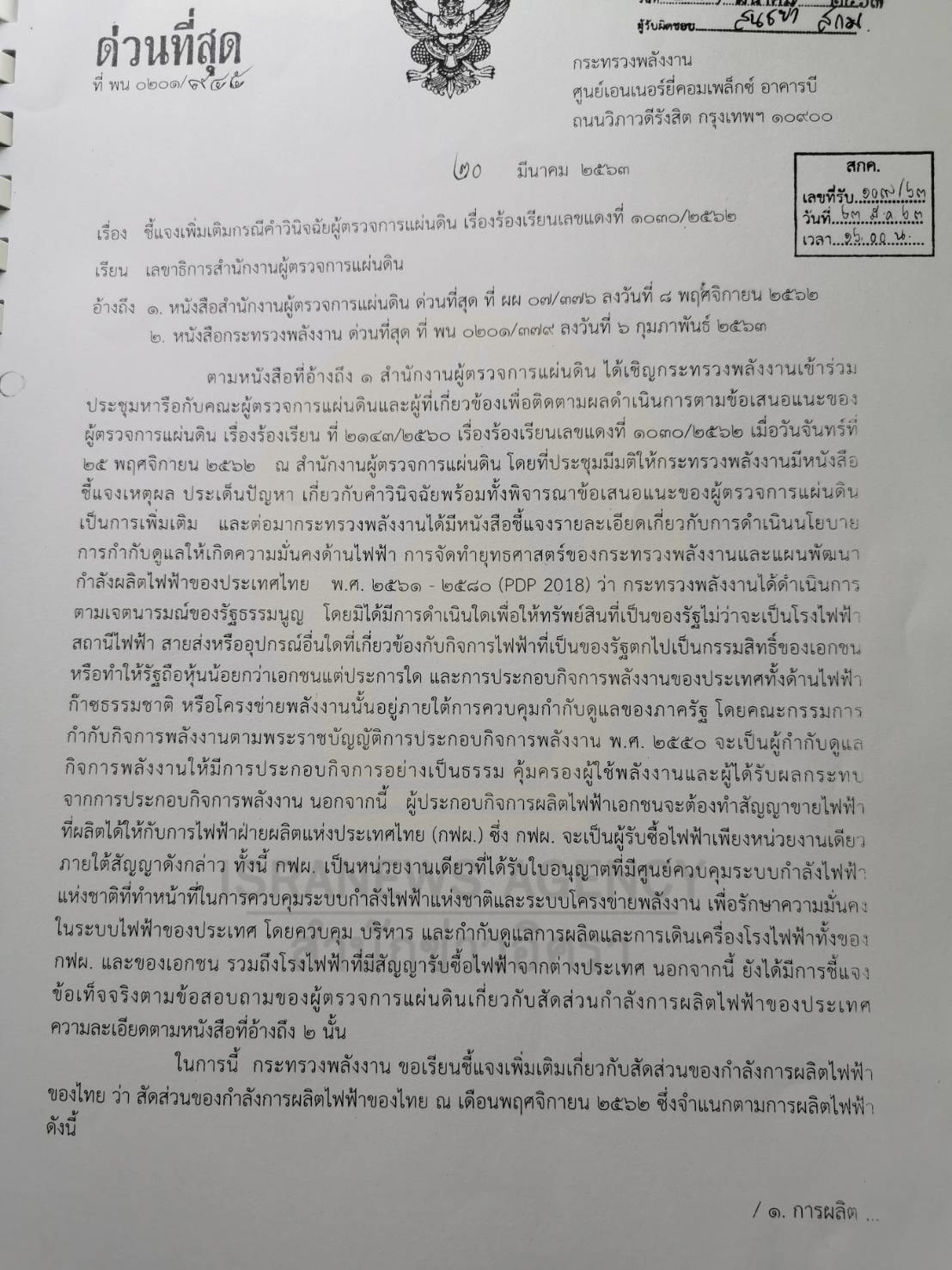 ต่อมากระทรวงพลังงานส่งหนังสือ ด่วนที่สุดที่ พน 0201/945 ลงวันที่ 20 มี.ค.2563 ชี้แจงเพิ่มเติมกรณีคำวินิจฉัยผู้ตรวจการแผ่นดิน เรื่องร้องเรียนเลขแดงที่ 1030/2562 เกี่ยวกับสัดส่วนของกำลังผลิตไฟฟ้าของไทย ว่า สัดส่วนของกำลังการผลิตไฟฟ้าของไทย ณ เดือน พ.ย.2562 จำแนกเป็น 4 กลุ่ม คือ