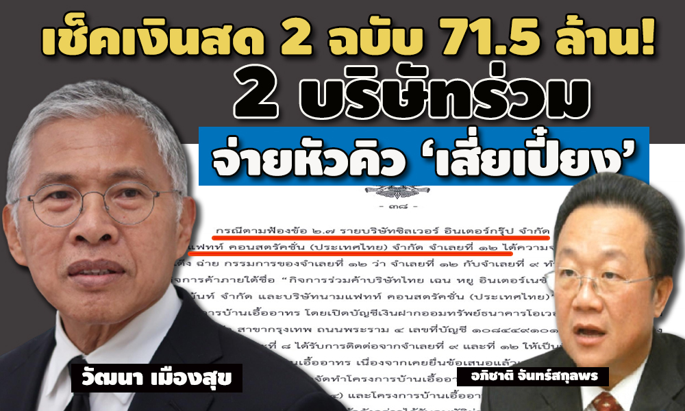 ชำแหละต่อเนื่อง ‘หัวคิว’ โครงการบ้านเอื้ออาทร! คราวนี้ ราย บ.ซิลเวอร์ อินเตอร์กรุ๊ป & นามแฟทท์ คอนสตรัคชั่น จ่าย 71.5 ล้าน แลกสัญญารับเหมา 6,500 หน่วย หลัง‘วัฒนา’ อนุมัติเงินล่วง 273 ล้าน ออกเช็ค 2 ฉบับโอนเข้าบัญชี 2 หญิงสาวลูกน้อง ‘เสี่ยเปี๋ยง’