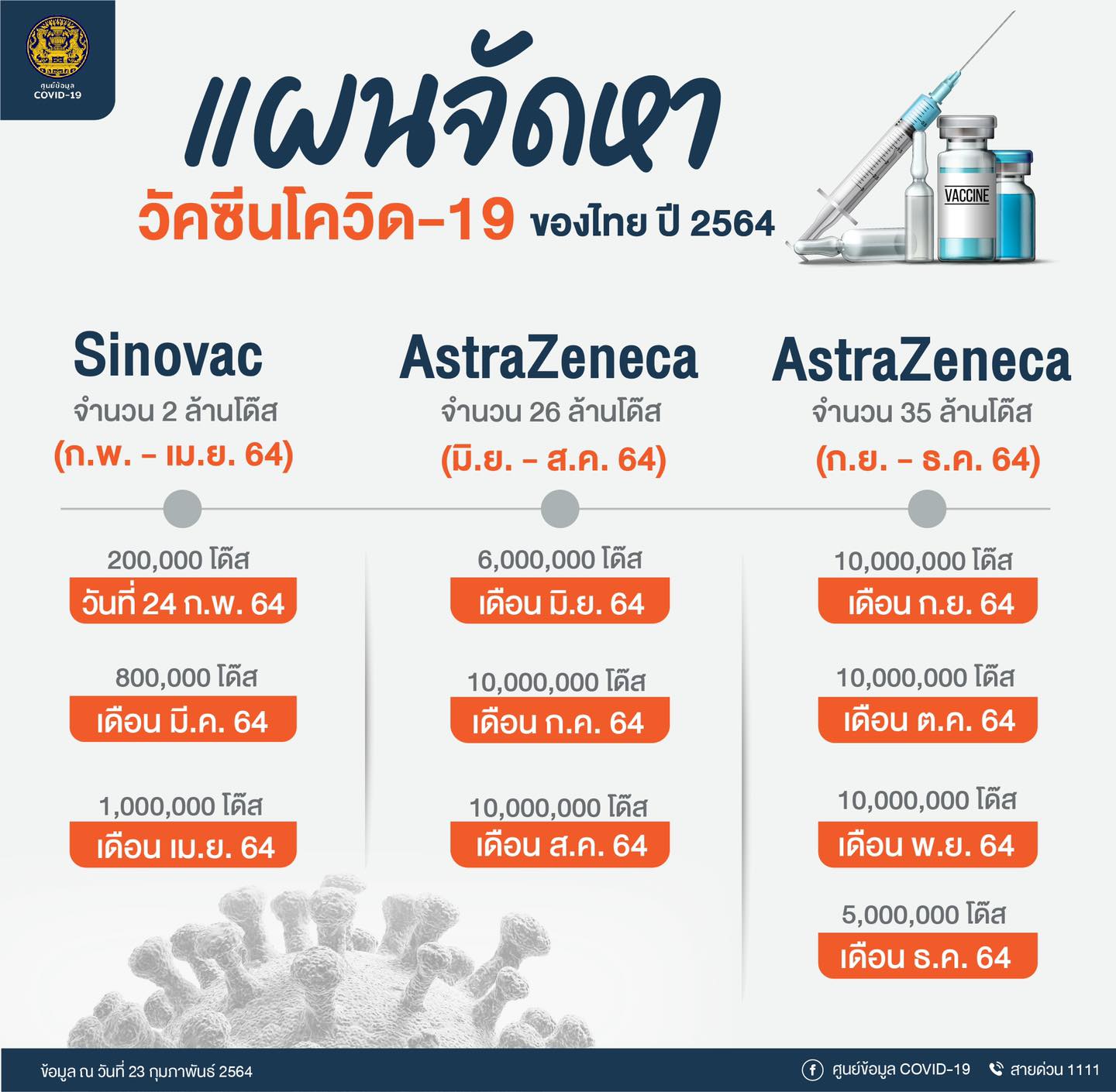 นพ.ทวีศิลป์ เปิดเผยแผนการจัดหาวัคซีนโควิดของประเทศไทยทั้ง 63 ล้านโดสอีกว่า ในระยะที่ 1 ไทยจะรับวัคซีนจากซิโนแวก รวม 2 ล้านโดส แบ่งเป็นเดือน ก.พ. 200,000 โดสเดือนมี.ค. 800,000 โดส และเดือนเมษายน 1 ล้านโดส ส่วนในระยะที่ 2 ไทยจะได้รับวัคซีนจากแอสตร้าเซนเนก้ารวม 61 ล้านโดส แบ่งเป็นเดือน มิ.ย. 6 ล้านโดส เดือนก.ค. 10 ล้านโดส เดือนส.ค. 10 ล้านโดส เดือนก.ย. 10 ล้านโดส เดือนต.ค. 10 ล้านโดส เดือนพ.ย. 10 ล้านโดส และเดือนธ.ค. 5 ล้านโดส