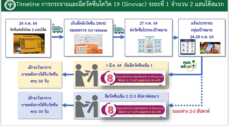"...การกระจายวัคซีนกว่า 63 ล้านโดส หากกระจาย 10 ล้านโดสต่อเดือนทันไหม ขอเรียนว่าตัวเลขดังกล่าวนี้มาจากจำนวนโรงพยาบาลสาธารณสุขกว่า 1,000 แห่ง แต่ละแห่งจะสามารถให้บริการประชาชนได้วันละ 500 โดสต่อวัน 20 วันทำการต่อเดือนก็จะครบ 10 ล้านโดสพอดี ซึ่งก็เป็นตัวเลขที่เราบริหารจัดการได้..."