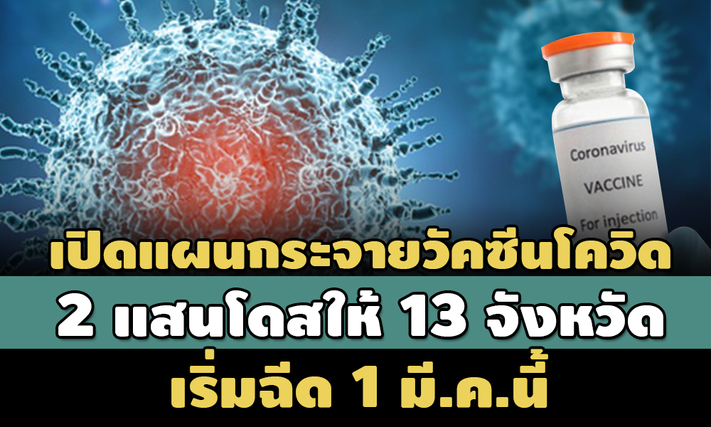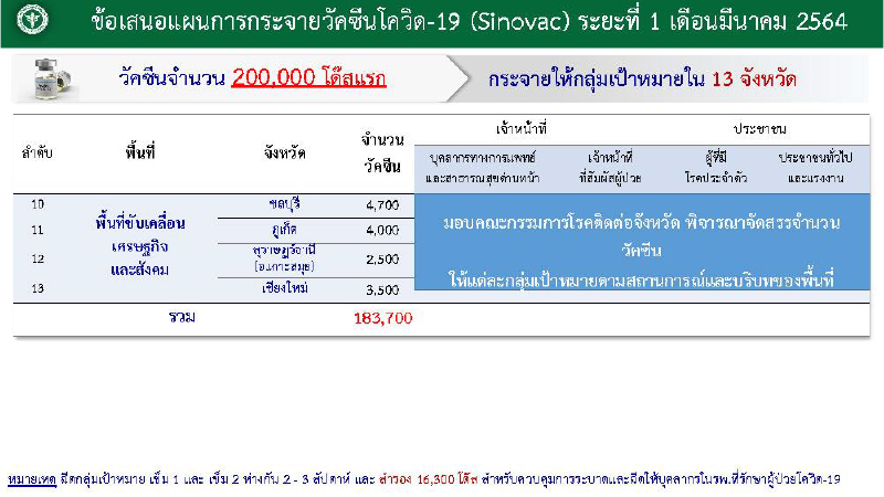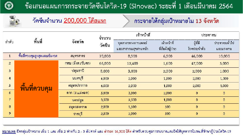 โดยมีแผนการกระจายวัคซีนระยะที่ 1 ในวันที่ 1 มี.ค.2564 ให้กับกลุ่มเป้าหมาย 13 จังหวัด ดังนี้