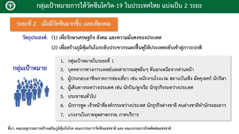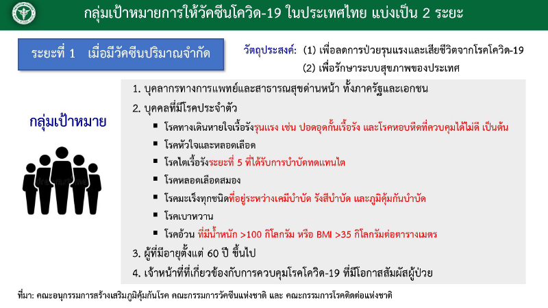 ทั้งนี้กลุ่มเป้าหมายที่จะได้รับวัคซีนโควิด จะถูกแบ่งออกเป็น 2 ระยะ