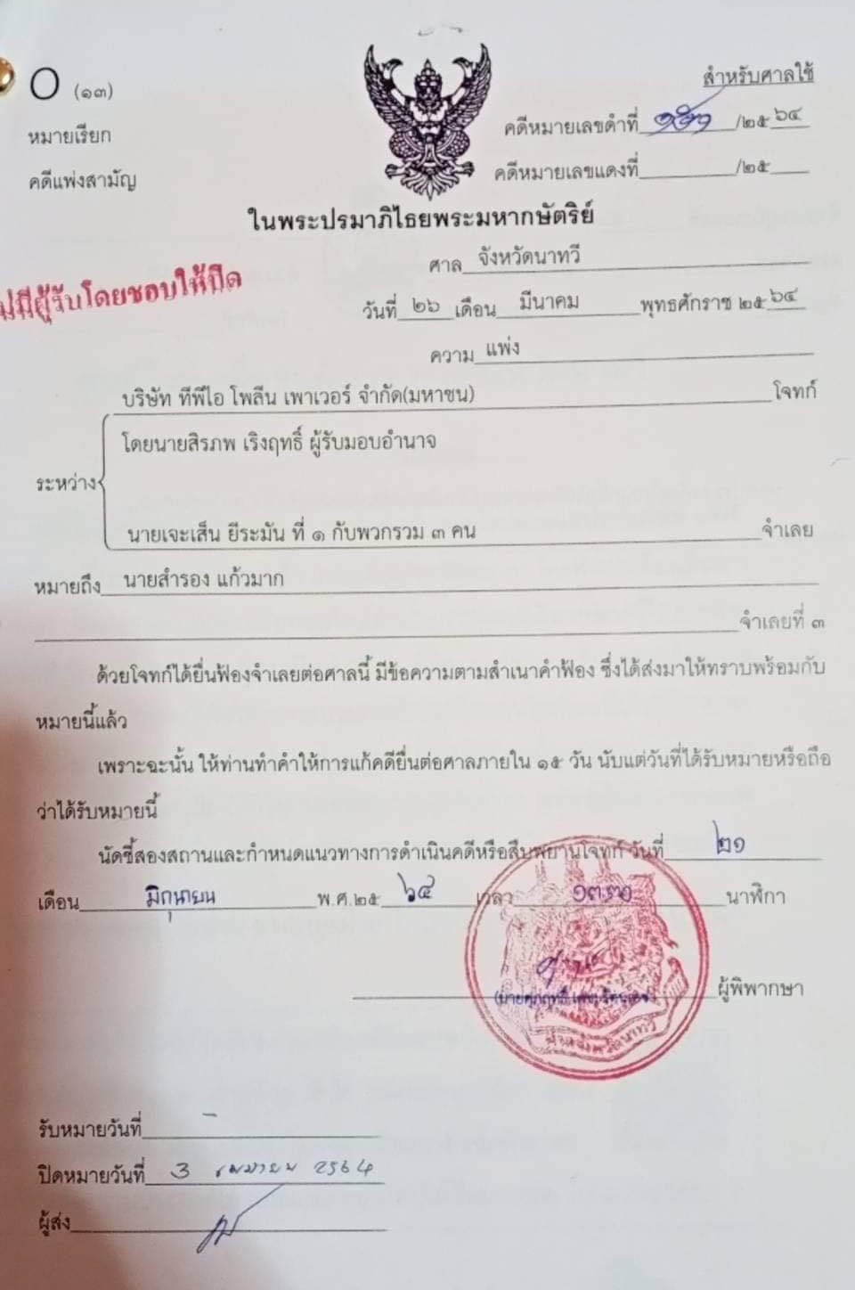 อย่างไรก็ตาม ก่อนหน้านั้น 2 สัปดาห์ คือ เมื่อวันที่ 12 มี.ค.2564 เจะเส็น ยีระมัน และชาวบ้าน 2 ราย เข้ายื่นฟ้องต่อศาลปกครองสงขลา โดยขอให้ศาลฯสั่งเพิกถอนเอกสารสิทธิ์ที่ดิน น.ส.3 ก. เลขที่ 437 เลขที่ดิน 81 ของ TPIPP เนื่องจากเป็นการออกเอกสารสิทธิ์ทับที่ดินทำกินที่ได้อาศัยอยู่มาตั้งแต่รุ่นปู่และรุ่นพ่อ
