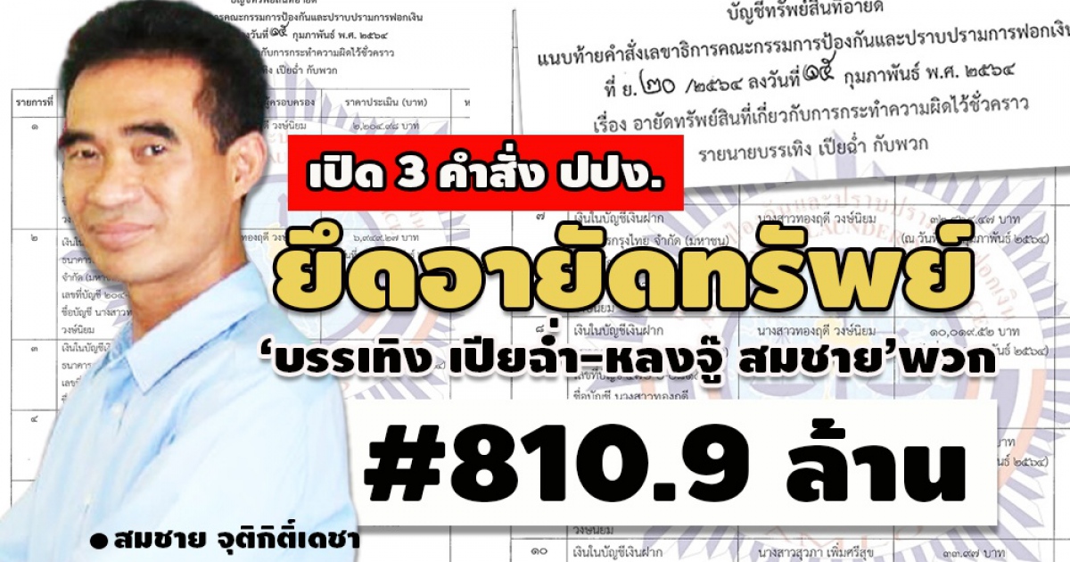 เผยโฉมเอกสารคำสั่ง ปปง.ยึดอายัดทรัพย์ 3 ลอต ก๊วน ‘บรรเทิง เปียฉ่ำ-หลงจู๊ สมชาย - ธนา จุติกิติ์เดชา’ กับพวก เจ้าของบ่อนมาบตาพุด จ.ระยอง 221 รายการ 810.9 ล้าน เงินฝาก ที่ดินสิ่งปลูกสร้าง รถยนต์ ในชื่อเครือญาติบริวาร