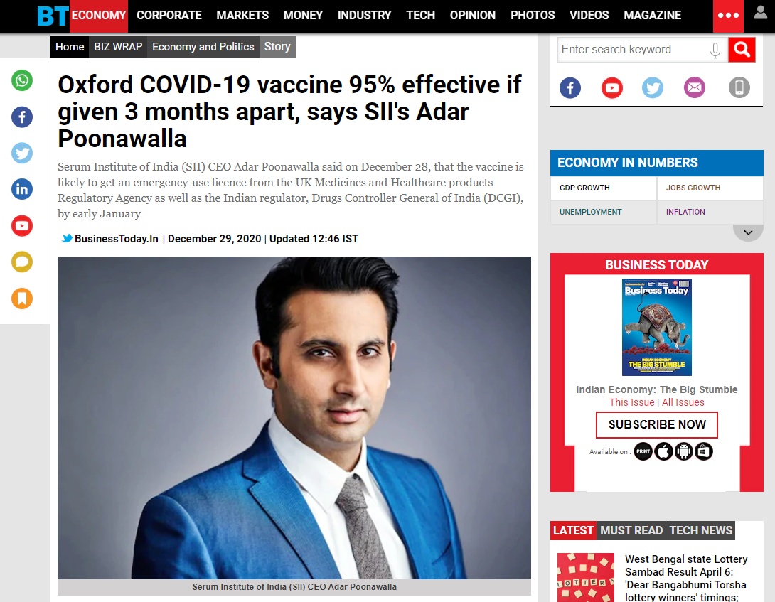 ผู้สื่อข่าวสำนักข่าวอิศรา รายงานว่า ได้สืบค้นข้อมูลในต่างประเทศเพื่อยืนยันคำให้สัมภาษณ์เพิ่มเติม พบว่าในช่วงปี 2563 เว็บไซต์ businesstoday.in ของอินเดีย เคยรายงานข่าวไว้ว่าวัคซีนแอสตร้าเซนเนก้านั้นถ้าทิ้งระยะเวลาการฉีดเอาไว้ที่ 3 เดือน จะให้ประสิทธิภาพได้ประมาณ 95 เปอร์เซ็นต์ (ดูภาพประกอบ)