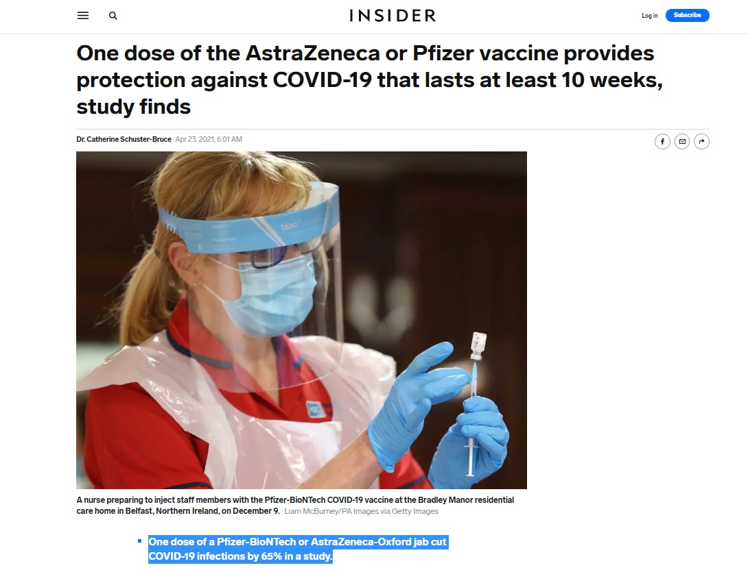 ขณะที่ในกรณีการฉีดวัคซีนแค่โดสเดียวนั้น มีข้อมูลอ้างอิงในเว็บไซต์ https://www.businessinsider.com/ ว่าทั้งวัคซีนจากแอสตร้าเซนเนก้าและวัคซีนจากไฟเซอร์มีประสิทธิภาพลดการติดไวรัสโควิด-19 อยู่ที่ 65 เปอร์เซ็นต์เท่าๆกัน (ดูภาพประกอบ)