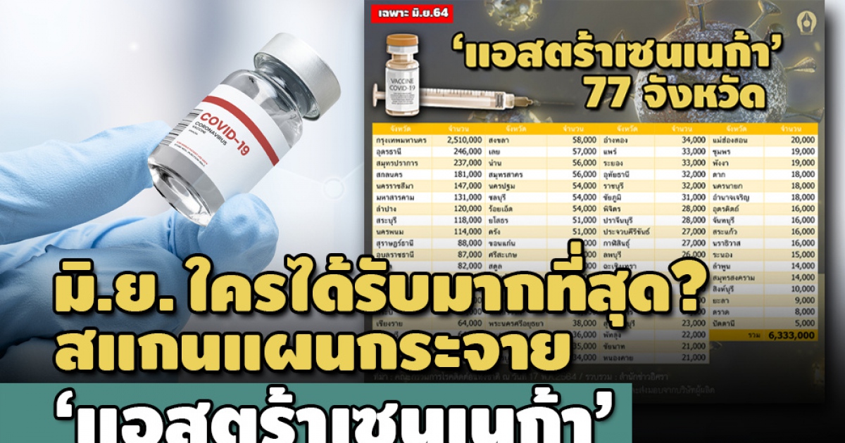 "...วัคซีนแอสตร้าเซนเนก้า ถูกคาดประมาณการไว้ว่าจะมีการจัดสรรตั้งแต่เดือน มิ.ย. - ก.ย.2564 รวมกว่า 47.1 ล้านโดส สำหรับจังหวัดที่จะได้รับวัคซีนมากที่สุดในเดือน มิ.ย. อาทิ กทม. 2,510,000 โดส , อุดรธานี 246,000 โดส , สมุทรปราการ 237,000 โดส , สกลนคร 181,000 โดส , นครราชสีมา 147,000 โดส..."