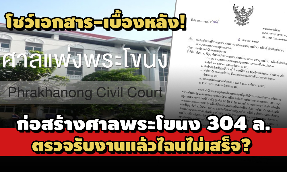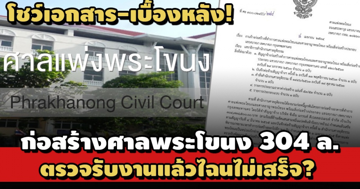 ตามที่สำนักงานศาลยุติธรรมลงนามก่อหนี้ผูกพันโครงการก่อสร้างอาคารที่ทำการศาลแพ่งพระโขนง และศาลอาญาพระโขนง พร้อมสิ่งก่อสร้างประกอบ โดยทำสัญญาจ้างบริษัท ซีเอ็ม แกรนด์ ดีเวลลอปเมนท์ จำกัด เป็นเงิน 304,738,500 บาท กำหนดแล้วเสร็จตามสัญญา วันที่ 4 มี.ค. 2565 ลันทึกต่อท้ายสัญญาจ้าง ครั้งที่ 2 สำนักงานศาลยุติธรรม พิจารณาขยายเวลาทำการก่อสร้างออกไปอีก 28 วัน กำหนดแล้วเสร็จ 1 เม.ย. 2565 โดยศาลแพ่งพระโขนงเป็นหน่วยเบิกจ่าย และมีข้าราชการฝ่ายตุลาการศาลยุติธรรมดำรงตำแหน่งในคณะกรรมการตรวจรับพัสดุงานจ้างก่อสร้างนั้น