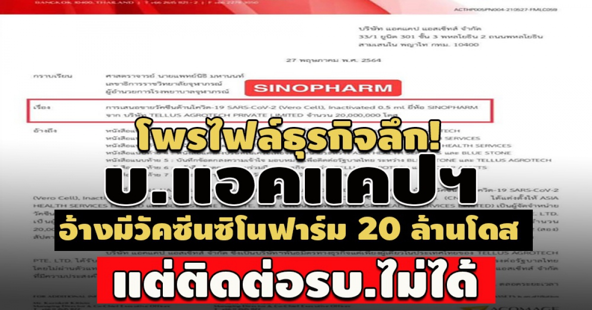 หลังมีการเผยแพร่จดหมายจากบริษัท แอคแคป แอสเซ็ทส์ จำกัด ส่งถึง ศ.นพ.นิธิ มหานนท์ เลขาธิการราชวิทยาลัยจุฬาภรณ์ ระบุว่า มีวัคซีนซิโนฟาร์ม 20 ล้านโดสพร้อมส่งให้ไทย แต่ตลอด 1 เดือนที่ผ่านมาไม่สามารถติดต่อรัฐบาล