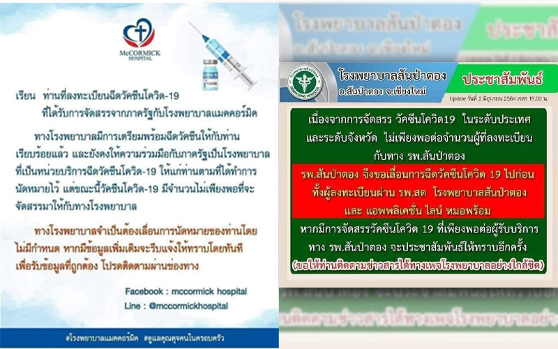 นอกจากนี้ยังมีอีกอย่างน้อย 4 โรงพยาบาลในจังหวัดเชียงใหม่ ที่ประกาศเลื่อนการฉีดออกไปอย่างไม่มีกำหนด ประกอบด้วย โรงพยาบาลแมคคอร์มิค โรงพยาบาลสันป่าตอง โรงพยาบาลกรุงเทพ และโรงพยาบาลเชียงใหม่ ราม ให้เหตุผลเดียวกันว่า ได้รับการจัดสรรวัคซีนไม่เพียงพอต่อจำนวนผู้ลงทะเบียนไว้