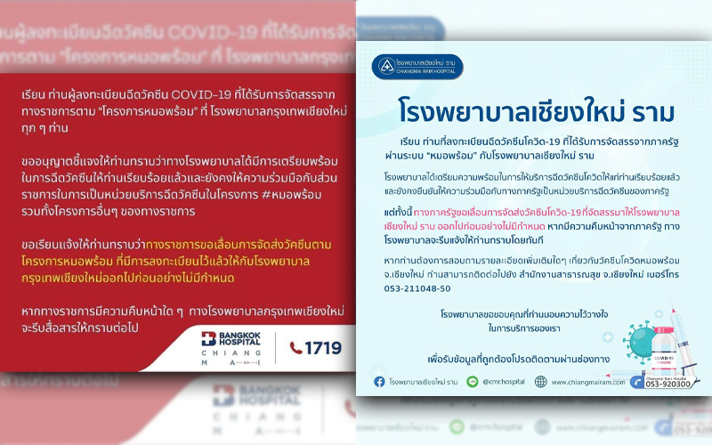 เช่นเดียวกับที่ โรงพยาบาลบางปะกอก 1 ประกาศว่า เนื่องจากมีการเปลี่ยนแปลงระบบการกระจายวัคซีนของภาครัฐ ทำให้โรงพยาบาลไม่ได้รับวัคซีนครบตามจำนวนและวันที่ตามที่ได้มีการลงทะเบียนไว้ จึงขอให้ผู้ลงทะเบียนกับโรงพยาบาลในเครือบางปะกอกไว้จำนวน 39,430 คน รับทราบว่าจะมีการดูแลคนไข้ทั้งหมดที่ลงทะเบียนไว้อย่างแน่นอน โดยจะปรับจำนวนที่ได้รับในแต่ละวันตามจำนวนวัคซีนที่ได้รับมาต่อไป และขอให้ติดตามข่าวจากเฟซบุ๊กและ SMS ที่จะแจ้งล่วงหน้า 1 วันต่อไป