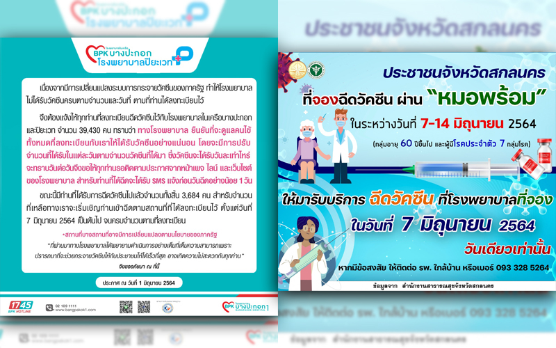 ส่วน ประชาสัมพันธ์จังหวัดสกลนคร แจ้งว่า ขอให้ประชาชนจังหวัดสกลนคร ที่จองฉีดวัคซีนผ่านหมอพร้อม ระหว่างวันที่ 7-14 มิ.ย.2564 ซึ่งเป็นกลุ่มอายุ 60 ปีขึ้นไป และผู้มีโรคประจำตัว 7 กลุ่มโรค ให้มารับบริการฉีดวัคซีนที่โรงพยาบาลที่จองในวันที่ 7 มิ.ย. เพียง “วันเดียว” เท่านั้น