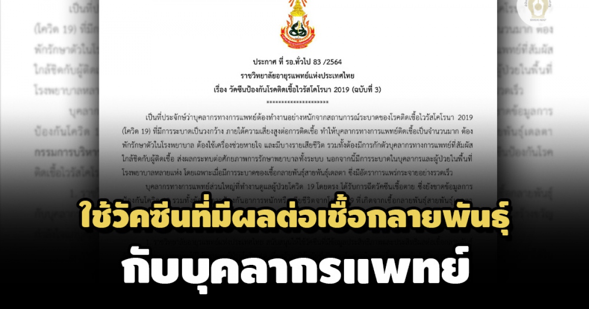 ผู้สื่อข่าวรายงานว่า เมื่อวันที่ 5 ก.ค.2564 พลอากาศโทนายแพทย์ อนุตตร จิตตินันทน์ ประธานราชวิทยาลัยอายุรแพทย์แห่งประเทศไทย ลงนามในประกาศที่ รอ.ทั่วไป 83/2564 เรื่อง วัคซีนป้องกันโควิด (ฉบับที่ 3) ระบุว่า เป็นที่ประจักษ์ว่าบุคลากรทางการแพทย์ต้องทำงานอย่างหนักจากสถานการณ์ระบาดของโรคโควิด ที่มีการระบาดเป็นวงกว้าง ภายใต้ความเสี่ยงสูงต่อการติดเชื้อ ทำให้บุคลากรทางการแพทย์ติดเชื้อเป็นจำนวนมาก ต้องพักรักษาตัวในโรงพยาบาล ต้องใช้เครื่องช่วยหายใจ และมีบางรายเสียชีวิต รวมทั้งต้องมีการกักตัวบุคลากรทางการแพทย์ที่สัมผัสใกล้ชิดกับผู้ติดเชื้อ ส่งผลกระทบต่อศักยภาพการรักษาพยาบาลทั้งระบบ นอกจากนี้มีการระบาดในบุคลากรและผู้ป่วยในพื้นที่โรงพยาบาลหลายแห่ง โดยเฉพาะเมื่อมีการระบาดของเชื้อกลายพันธุ์สายพันธุ์เดลตา ซึ่งมีอัตราการแพร่กระจายอย่างรวดเร็ว
