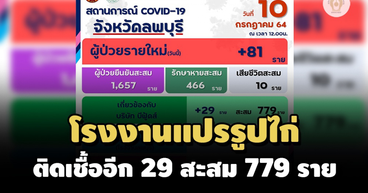 โรงงานแปรรูปไก่ จ.ลพบุรี ติดโควิดเพิ่ม 29 รวมสะสม 779 ราย ออกประกาศคุมเข้มโควิด ตรวจคัดกรองเชิงรุก จัดที่พัก-อาหาร แยกพนักงานออกจากชุมชน พร้อมเร่งฉีดวัคซีนให้กลุ่มเสี่ยง ตั้งแต่วันที่ 12 ก.ค.เป็นต้นไป