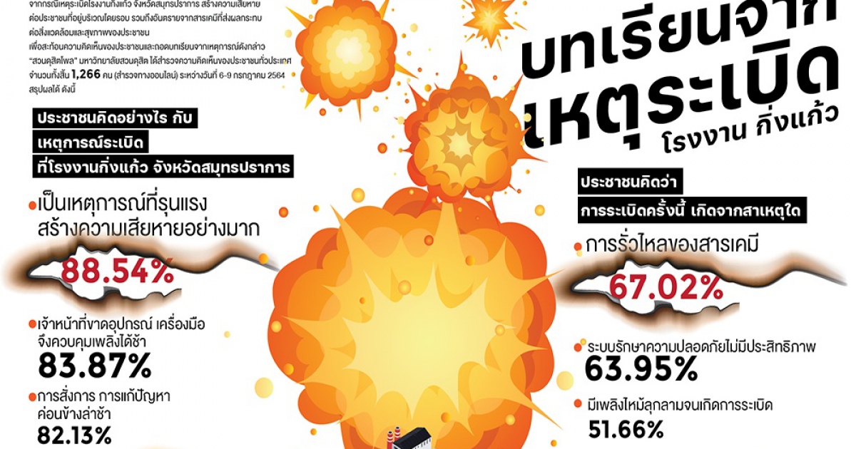 สวนดุสิตโพล มหาวิทยาลัยสวนดุสิต สำรวจความคิดเห็นของประชาชนต่อกรณี บทเรียนจากเหตุระเบิดโรงงาน กิ่งแก้ว จังหวัดสมุทรปราการ กลุ่มตัวอย่าง จำนวน 1,266 คน ระหว่างวันที่ 6-9 กรกฎาคม 2564 พบว่า ประชาชนมองว่าเหตุการณ์นี้รุนแรง สร้างความเสียหายอย่างมาก ร้อยละ 88.54 คิดว่าเกิดจากสาเหตุการรั่วไหลของสารเคมี ร้อยละ 67.02 สิ่งที่อยากฝากถึงรัฐบาล คือ ควรตรวจสอบโรงงานต่าง ๆ อย่างต่อเนื่อง ป้องกันไม่ให้เกิดเหตุซ้ำ ร้อยละ 92.00 บทเรียน ที่ได้รับคือ ควรให้ความสำคัญกับงานบรรเทาและป้องกันสาธารณภัยมากขึ้น ร้อยละ 69.99 ทั้งนี้ยังไม่ค่อยพอใจกับการแก้ปัญหาในภาพรวม ร้อยละ 39.38