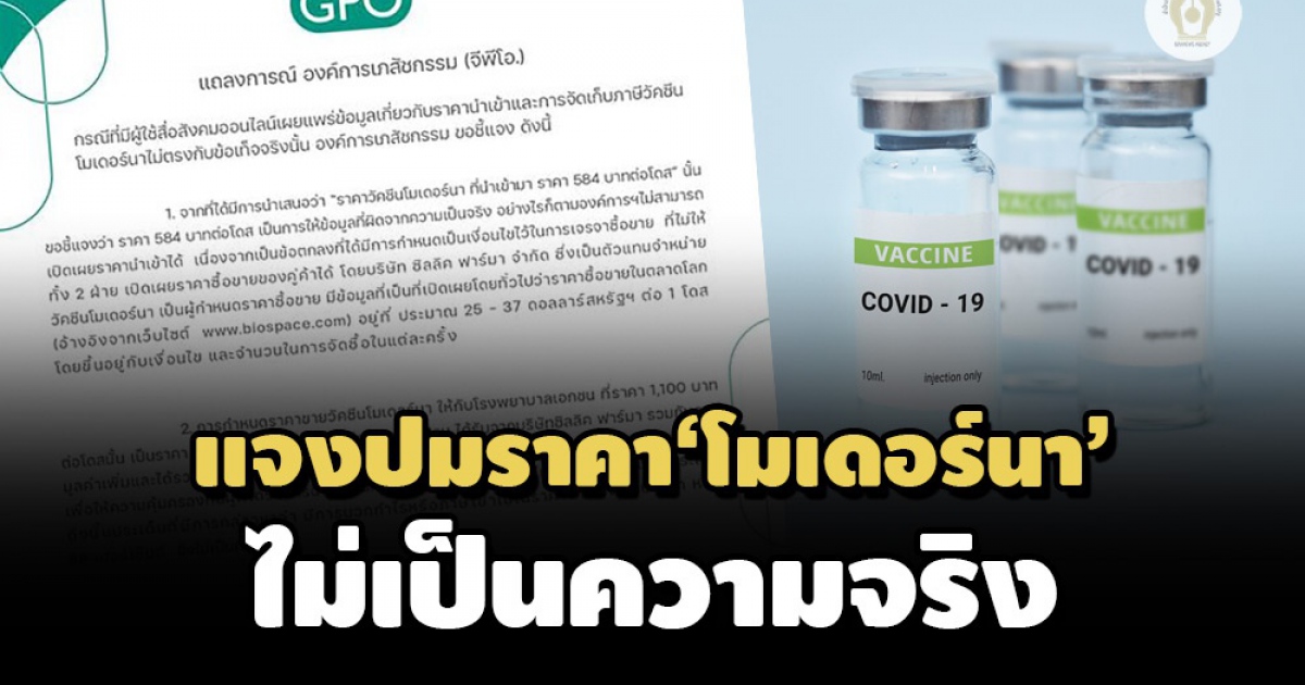 องค์การเภสัชกรรมชี้แจงกรณีสื่อสังคมออนไลน์เผยแพร่ข้อมูลราคานำเข้าวัคซีนโมเดอร์นา 584 บาทต่อโดส เป็นการให้ข้อมูลที่คลาดเคลื่อน เผยเงื่อนไขระบุไม่สามารถเปิดราคาได้ ส่วนการจัดเก็บภาษีกว่า 88 เปอร์เซ็นต์ ยันไม่ตรงกับข้อเท็จจริง