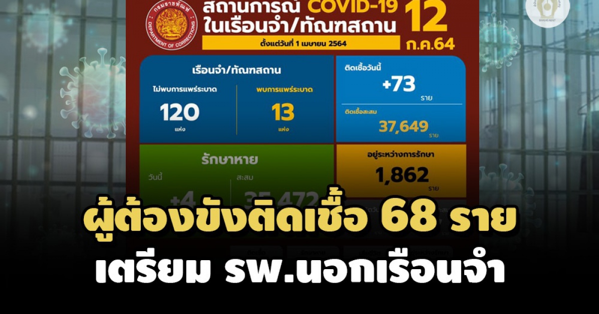 ผู้ต้องขังติดเชื้อใหม่ 73 ราย อยู่ระหว่างรักษา 1,862 คน หายป่วยเพิ่ม 4 ราย รวมหายป่วยแล้ว 94.2% ราชทัณฑ์เผยภาพรวมการระบาดยังดีขึ้น โดยเฉพาะพื้นที่ กทม.-นนทบุรี แจงมาตรการป้องกันเชื้อ เน้นย้ำเจ้าหน้าที่ปฏิบัติตามอย่างเคร่งครัด ด้านกระทรวงยุติธรรมเตรียมตั้ง รพ.สนามนอกเรือนจำ รองรับผู้ต้องขังใหม่ติดเชื้อจากภายนอก