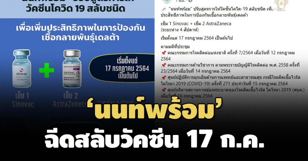 ผู้สื่อข่าวรายงานว่า เมื่อวันที่ 16 ก.ค.2564 สำนักงานสาธารณสุขจังหวัดนนทบุรี โพสต์ข้อความผ่านเฟซบุ๊ก ระบุว่า 'นนท์พร้อม' ปรับสูตรการให้วัคซีนโควิดสลับชนิด เพื่อเพิ่มประสิทธิภาพในการป้องกันเชื้อกลายพันธุ์เดลต้า โดยเข็ม 1 คือ ซิโนแวค และ เข็ม 2 คือ แอสตร้าเซนเนก้า ระยะห่างกัน 4 สัปดาห์ โดยเริ่มตั้งแต่วันที่ 17 ก.ค.2564 เป็นต้นไป