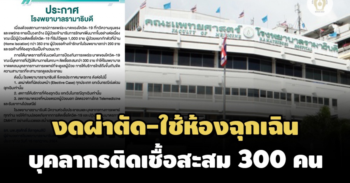 คณะแพทยศาสตร์ รพ.รามาธิบดี ประกาศงดผ่าตัด-ใช้ห้องฉุกเฉิน ยกเว้นกรณีเร่งด่วนฉุกเฉิน หลังคนไข้ล้น-บุคลากรติดโควิดสะสมกว่า 300 ราย