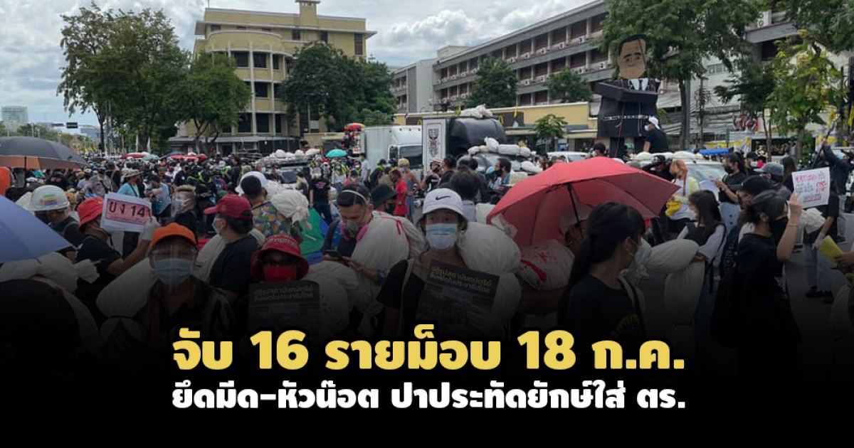 บช.น.รายงานผลการจับกุมผู้ต้องหาม็อบปลดแอก-แนวร่วมกลุ่มราษฎร 18 ก.ค. รวม 16 ราย โดน 4 คดี สร้างความปั่นป่วนกระด้างกระเดื่องในหมู่ประชาชน-ทำร้ายร่างกายเจ้าพนักงาน-ทำกิจกรรมเสี่ยงต่อการแพร่เชื้อโรค พบปาประทัดยักษ์ใส่ ตร. ยึดมีด-หัวน๊อต ด้วย 'พล.ต.ต.ปิยะ' ยันทำตามขั้นตอน ประกาศเตือนผู้ชุมนุมตลอดเวลา