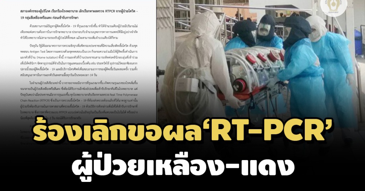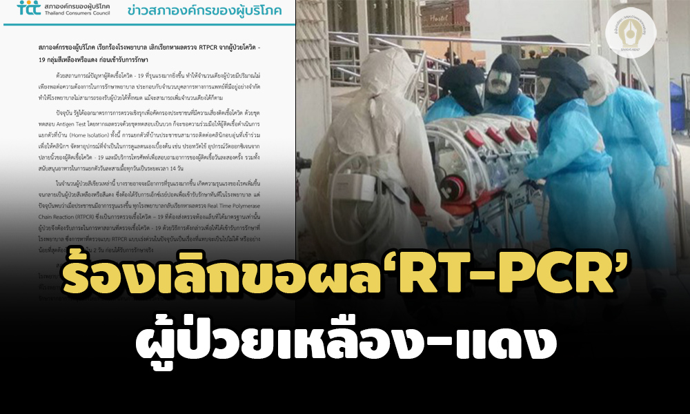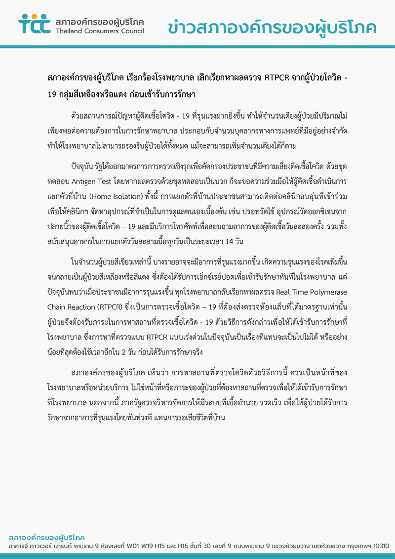 'สภาองค์กรของผู้บริโภค' เรียกร้อง รพ. เลิกขอผลตรวจหาเชื้อแบบ RT-PCR จากผู้ป่วยโควิดกลุ่มสีเหลือง-แดง เพื่อให้เข้ารับการรักษาโดยเร็ว หลังพบผู้ป่วยสีเขียวที่ผ่านการตรวจหาเชื้อด้วย Antigen Test ต้องรับภาระหาผลตรวจแบบดังกล่าว ซึ่งใช้เวลาราว 2 วัน ถึงจะได้เข้าสู่ระบบการรักษา