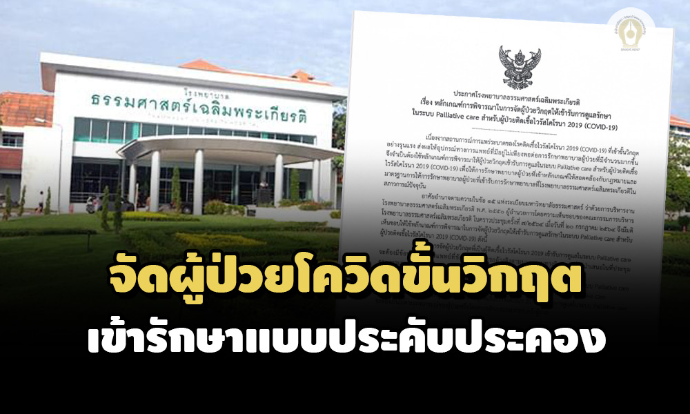 อาศัยอำนาจตามความในข้อ 15 แห่งระเบียบมหาวิทยาลัยธรรมศาสตร์ ว่าด้วยการบริหารงานโรงพยาบาลธรรมศาสตร์เฉลิมพระเกียรติ พ.ศ.2550 ผู้อำนวยการโดยความเห็นชอบของคณะกรรมการ โรงพยาบาลธรรมศาสตร์เฉลิมพระเกียรติ ในคราวประชุมครั้งที่ 7/2564 เมื่อวันที่ 20 ก.ค. 2564 จึงมีมติเห็นชอบให้ใช้หลักเกณฑ์การพิจารณาในการจัดผู้ป่วยวิกฤตให้เข้ารับการดูแลรักษาในระบ Palliative care สำหรับผู้ป่วยติดเชื้อไวรัสโควิด ดังนี้
