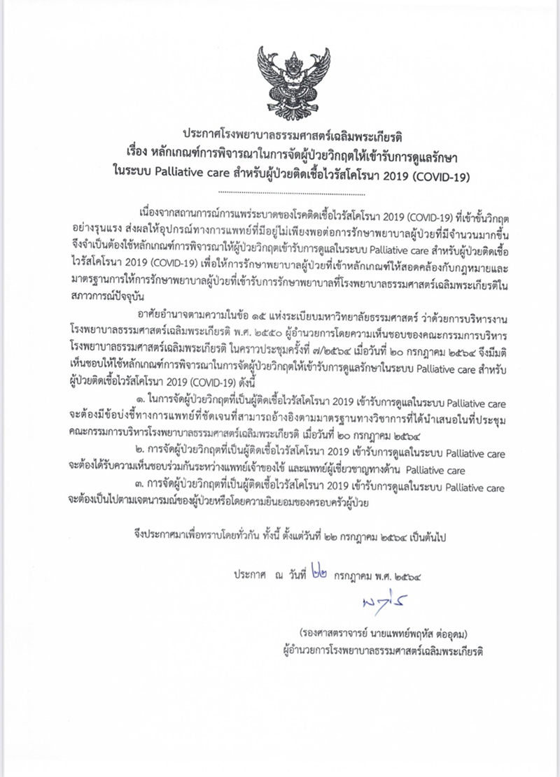 โดยมีใจความสำคัญระบุว่า เนื่องจากสถานการณ์การระบาดของโควิดที่เข้าขั้นวิกฤตอย่างรุนแรง ส่งผลให้อุปกรณ์ทางการแพทย์ที่มีอยู่ ไม่เพียงพอต่อการรักษาพยาบาลผู้ป่วยที่มีจำนวนมากขึ้น จึงจำเป็นต้องใช้หลักเกณฑ์การพิจารณาให้ผู้ป้วยวิกฤตเข้ารับการดูแลในระบบ Palliative care สำหรับผู้ป่วยติดเชื้อโควิด เพื่อให้การรักษาพยาบาลผู้ป่วยที่เข้าหลักเกณฑ์ให้สอดคล้องกับกฎหมายและมาตรฐานการรักษาผู้ป่วยที่โรงพยาบาลธรรมศาสตร์เฉลิมพระเกียรติในสถานการณ์ปัจจุบัน