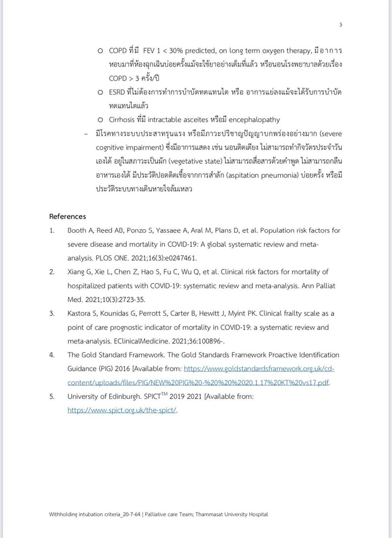 3. การจัดผู้ป่วยวิกฤตที่เป็นผู้ติดเชื้อเข้ารับการดูแลในระบบ Paliative care จะต้องเป็นไปตามเจตนารมณ์ของผู้ป่วยหรือโดยความยินยอมของครอบครัวผู้ป่วย