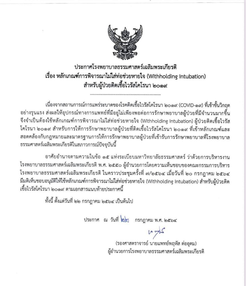 รพ.ธรรมศาสตร์เฉลิมพระเกียรติ ออกประกาศหลักเกณฑ์พิจารณาไม่ใส่ท่อช่วยหายใจผู้ป่วยโควิด ระบุวิกฤตเกินรับไหว-อุปกรณ์การแพทย์ไม่พอ