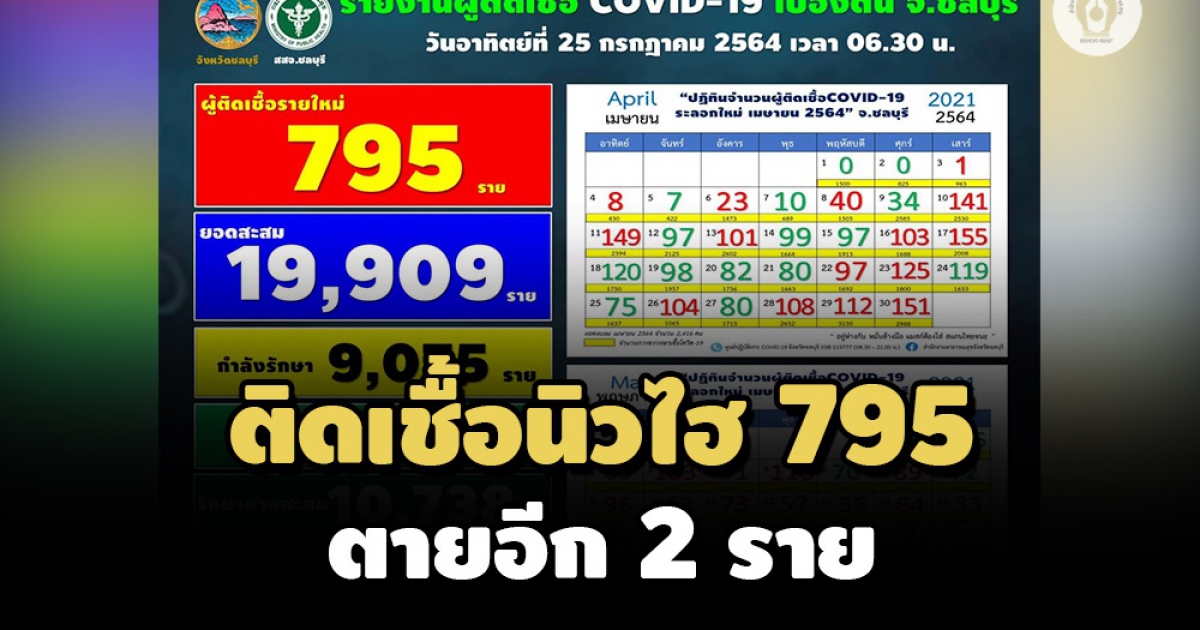 ผู้สื่อข่าวรายงานว่า เมื่อวันที่ 25 ก.ค.2564 สำนักงานประชาสัมพันธ์จังหวัดชลบุรี รายงานสถานการณ์ประจำวันผ่านเฟซบุ๊ก สำนักงานประชาสัมพันธ์จังหวัดชลบุรี - Chinburi PR พบผู้ติดเชื้อรายใหม่ 795 ราย ทำให้มียอดผู้ป่วยสะสม 19,909 ราย รักษาหายเพิ่ม 298 ราย รักษาหายสะสม 10,738 ราย อยู่ระหว่างการรักษาตัว 9,075 ราย เสียชีวิต 2 ราย และเสียชีวิตสะสม 96 ราย