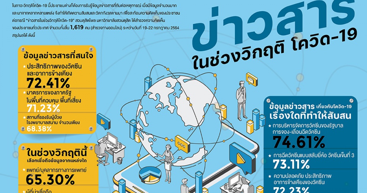 สวนดุสิตโพล มหาวิทยาลัยสวนดุสิต สำรวจความคิดเห็นของประชาชนต่อกรณี “ข่าวสารในช่วงวิกฤติ โควิด-19” กลุ่มตัวอย่างจำนวน 1,619 คน ระหว่างวันที่ 19-22 กรกฎาคม 2564 พบว่า ประชาชนสนใจข่าวประสิทธิภาพของวัคซีนและอาการข้างเคียงมากที่สุด ร้อยละ 72.41 เลือกเชื่อถือข้อมูลจากแพทย์และบุคลากรทางการแพทย์ ร้อยละ 65.30 ข้อมูลข่าวสารทำให้รู้สึกสับสนมาก ร้อยละ 43.99 โดยสับสนข้อมูลเกี่ยวกับการบริหารจัดการวัคซีนของรัฐบาล การจองและเลื่อนฉีดวัคซีนมากที่สุด ร้อยละ 74.61 เมื่อได้รับข้อมูลข่าวสารจะดูแลตัวเองมากขึ้น ร้อยละ 90.78 และภาพรวมเมื่อรับรู้ข้อมูลข่าวสารแล้วรู้สึกวิตกกังวลมากจนเริ่มรบกวนชีวิตประจำวัน ร้อยละ 36.34