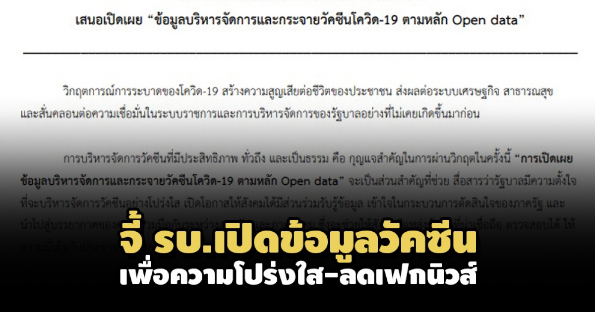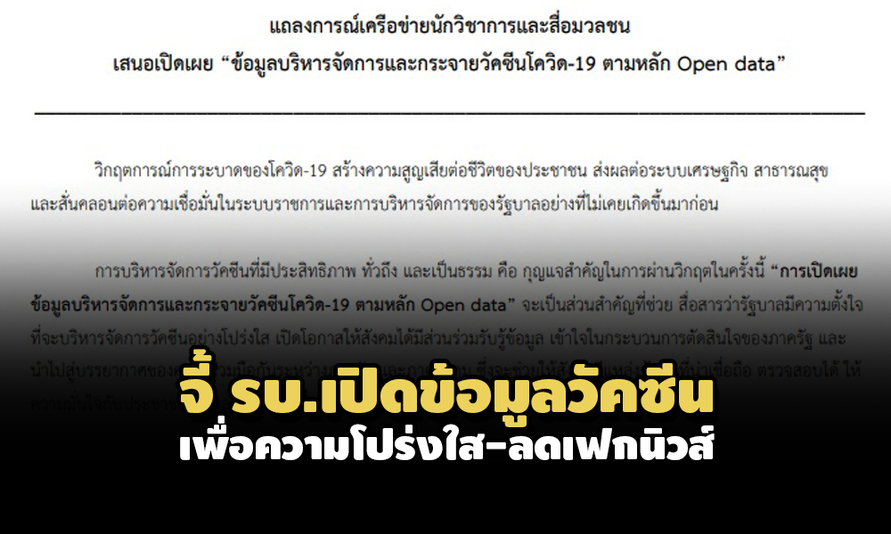 การบริหารจัดการวัคซีนที่มีประสิทธิภาพ ทั่วถึง และเป็นธรรม คือ กุญแจสำคัญในการผ่านวิกฤตในครั้งนี้การเปิดเผยข้อมูลบริหารจัดการและกระจายวัคซีนโควิด-19 ตามหลัก Open data จะเป็นส่วนสำคัญที่ช่วย สื่อสารว่ารัฐบาลมีความตั้งใจที่จะบริหารจัดการวัคซีนอย่างโปร่งใส เปิดโอกาสให้สังคมได้มีส่วนร่วมรับรู้ข้อมูล เข้าใจในกระบวนการตัดสินใจของภาครัฐ และนำไปสู่บรรยากาศของความร่วมมือกันระหว่างภาครัฐ และภาคสังคม ซึ่งจะช่วยให้สังคมมีแหล่งข้อมูลที่น่าเชื่อถือ ตรวจสอบได้ ให้ความมั่นใจกับประชาชน และลดปัญหาความสับสนจากปัญหาข่าวลือและข่าวปลอม