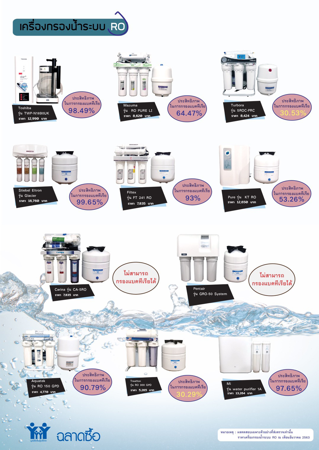 -เครื่องกรองน้ำที่มีประสิทธิภาพในการกรองแบคทีเรียมากกว่าร้อยละ 80 ได้แก่ Toshiba รุ่น TWP-N1890UK Stiebel Eltron รุ่น Glacier Filtex รุ่น FT 241 RO Aquatek รุ่น RO 150 GPD และ Mi รุ่น water purifier 1A