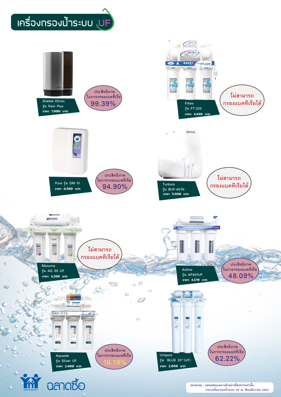 -เครื่องกรองน้ำที่มีประสิทธิภาพในการกรองแบคทีเรียน้อยกว่าร้อยละ 50 ได้แก่ Astina รุ่น AP401UF และ Aquatek รุ่น Silver UF