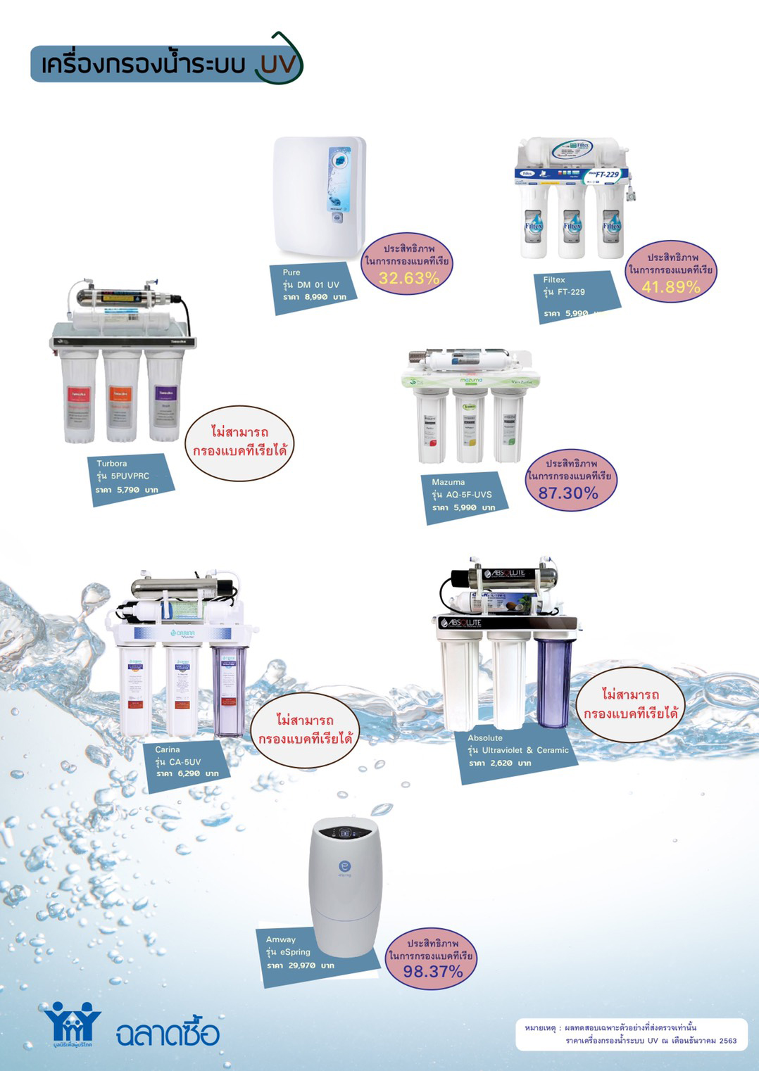 -เครื่องกรองน้ำที่ไม่สามารถกรองแบคทีเรียได้ ได้แก่ Turbora รุ่น 5PUVPRC ,Carina รุ่น CA-5UV และ Absolute รุ่น Ultraviolet & Ceramic