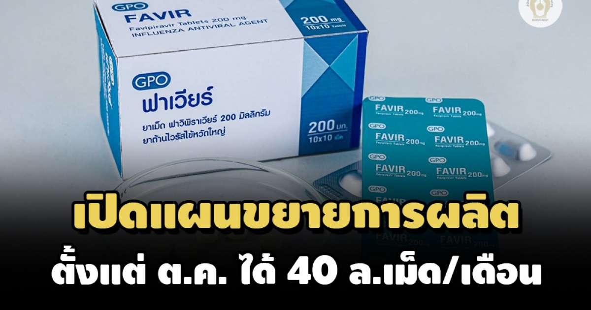 องค์การเภสัชกรรมเปิดเผยแผนขยายการผลิต 'ยาฟาวิพิราเวียร์' ตั้งเป้าตั้งแต่ ต.ค.64 ได้มากกว่า 40 ล้านเม็ดต่อเดือน พร้อมเตรียมเปิดโรงงานผลิตยาสายการผลิตที่ 5 ที่คลอง 10 อ.ธัญบุรี จ.ปทุมธานี คาดผลิตได้ 2,000 ล้านเม็ดต่อปี หรือเดือนละ160 ล้านเม็ดต่อเดือน