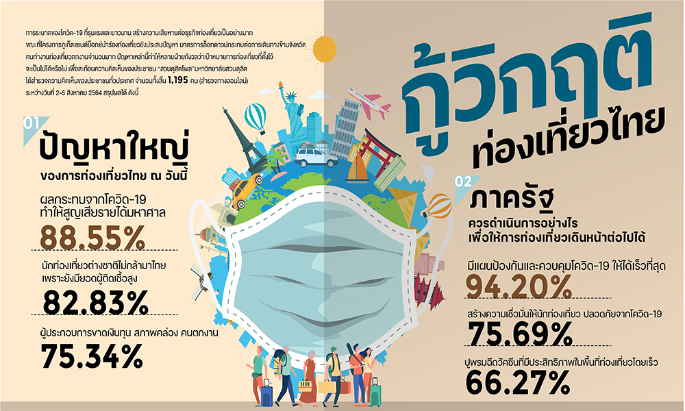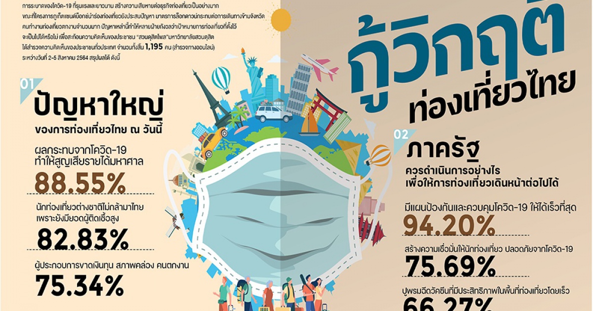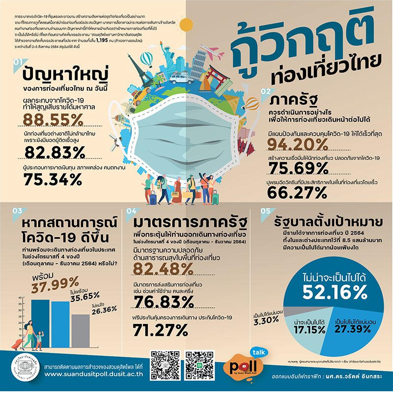 สวนดุสิตโพล มหาวิทยาลัยสวนดุสิต สำรวจความคิดเห็นของประชาชนต่อกรณี “กู้วิกฤติท่องเที่ยวไทย” กลุ่มตัวอย่างจำนวน 1,195 คน ระหว่างวันที่ 2-5 สิงหาคม 2564 พบว่า ประชาชนมองว่าปัญหาใหญ่การท่องเที่ยว ณ วันนี้ คือ โควิด-19 ทำให้สูญเสียรายได้มหาศาล ร้อยละ 88.55 ภาครัฐควรมีแผนป้องกันและควบคุมโควิด-19 ให้ได้ เร็วที่สุด ร้อยละ 94.20 ในช่วงสิ้นปีหากสถานการณ์ดีขึ้น ประชาชนพร้อมจะเดินทางท่องเที่ยว ร้อยละ 37.99 และไม่พร้อม ร้อยละ 35.65 หากจะกระตุ้นให้ประชาชนเดินทางท่องเที่ยว ภาครัฐจะต้องมีมาตรฐานความปลอดภัยด้านสาธารณสุข ในพื้นที่ท่องเที่ยว ร้อยละ 82.48 และคิดว่าการตั้งเป้าหมายรายได้ท่องเที่ยว 8.5 แสนล้านบาทนั้นไม่น่าจะเป็นไปได้ ร้อยละ 52.16