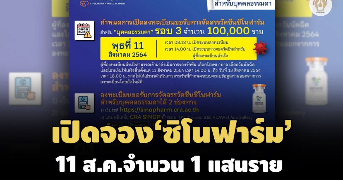 ผู้สื่อข่าวรายงานว่า เมื่อวันที่ 9 ส.ค.2564 ราชวิทยาลัยจุฬาภรณ์ แจ้งกำหนดการเปิดลงทะเบียนขอรับการจัดสรรวัคซีนซิโนฟาร์ม สำหรับ บุคคลธรรมดา รอบที่ 3 โดยจะเปิดให้ลงทะเบียน จำนวนน 100,000 ราย ตั้งแต่เวลา 08.18 น. ของวันที่ 11 ส.ค.2564
