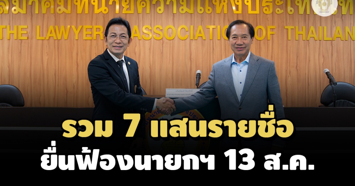 สมาคมทนายความแห่งประเทศไทญ จับมือพรรคไทยสร้างไทย รวม 7 แสนรายชื่อยื่นฟ้องนายกฯ ฐานะ ผอ.ศบค. ชี้ปฏิบัติหน้าที่มิชอบ แก้โควิดล้มเหลว ในวันศุกร์ที่ 13 ส.ค.2564 เวลา 10.30 น.