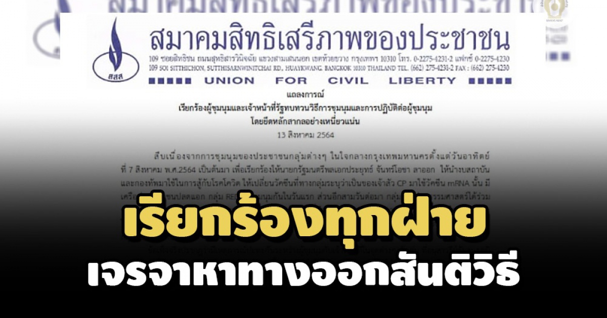 ผู้สื่อข่าวรายงานว่า เมื่อวันที่ 13 ส.ค.2564 สมาคมสิทธิเสรีภาพของประชาชน (สสส.) ออกแถลงการณ์ เรียกร้องผู้ชุมนุมและเจ้าหน้าที่รัฐทบทวนวิธีการชุมนุมและการปฏิบัติต่ออผู้ชุมนุม โดยยึดหลักสากลอย่างเหนี่ยวแน่น ระบุว่า สืบเนื่องจากการชุมนุมของประชาชนกลุ่มต่างๆ ในใจกลางกรุงเทพมหานครตั้งแต่วันอาทิตย์ที่ 7 ส.ค. 2564 เป็นต้นมา เพื่อเรียกร้องให้พล.อ.ประยุทธ์ จันทร์โอชา นายกรัฐมนตรีลาออก ให้นำงบสถาบันและกองทัพมาใช้ในการสู้กับโรคโควิด ให้เปลี่ยนวัคซีนที่ทางกลุ่มระบุว่าเป็นของเจ้าสัว CP มาใช้วัคซีน mRNA นั้น มีเครือข่ายเยาวชนปลดแอก กลุ่ม REDEM ชุมนุมกันในวันแรก ส่วนอีก 3 วันต่อมา กลุ่มแนวร่วมธรรมศาสตร์ได้ร่วมชุมนุมกับกลุ่ม Car Mob โดยรัฐบาลได้เตรียมกำลังเจ้าหน้าที่ตำรวจควบคุมฝูงชนหลายกองร้อยเพื่อรับมือกับมวลชน โดยทั้งสองฝ่ายไม่มีการเสนอตัวแทนเพื่อเจรจาระหว่างการชุมนุม และไม่สามารถกุมสภาพเพื่อหลีกเลี่ยงความรุนแรงจากกลุ่มคนไม่หวังดีนั้น