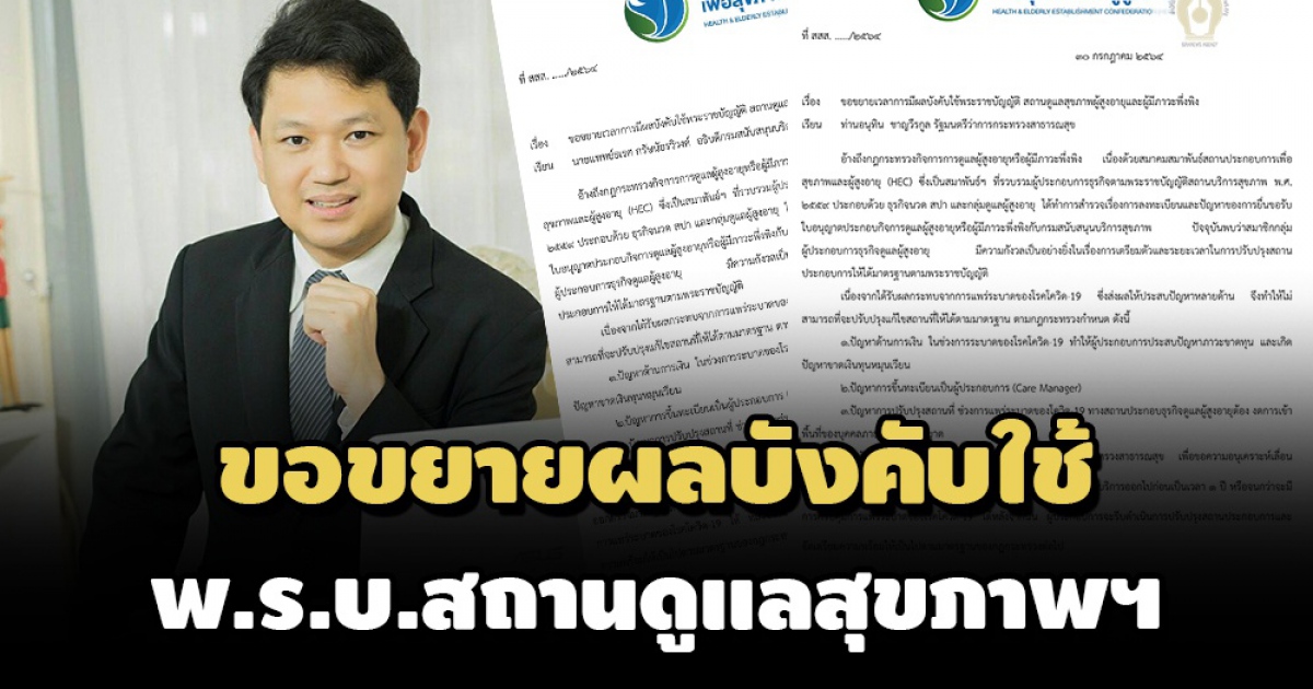 นายกสมาคมสมาพันธ์สถานประกอบการเพื่อสุขภาพและผู้สูงอายุ (HEC) ออกจดหมายขอขยายผลบังคับใช้ พ.ร.บ.สถานดูแลสุขภาพผู้สูงอายุและผู้มีภาวะพึ่งพิง ออกไปก่อนอีก 1 ปีหรือจนกว่าการระบาดจะคุมได้ เหตุได้รับผลกระทบจากโควิด ทำให้ไม่สามารถปรับปรุงสถานประกอบการได้ตามพระราชบัญญัติกำหนด