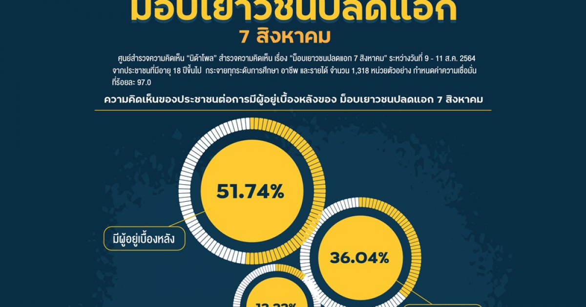 "...“นิด้าโพล” เปิดเผยผลสำรวจของประชาชน เรื่อง “ม็อบเยาวชนปลดแอก 7 สิงหาคม” พบว่า ส่วนใหญ่ ร้อยละ 51.74 ระบุว่า มีผู้อยู่เบื้องหลัง ขณะที่ ร้อยละ 36.04 ระบุว่า ไม่มีผู้อยู่เบื้องหลัง และร้อยละ 12.22 ระบุว่า เฉย ๆ/ไม่ตอบ/ไม่สนใจ..."