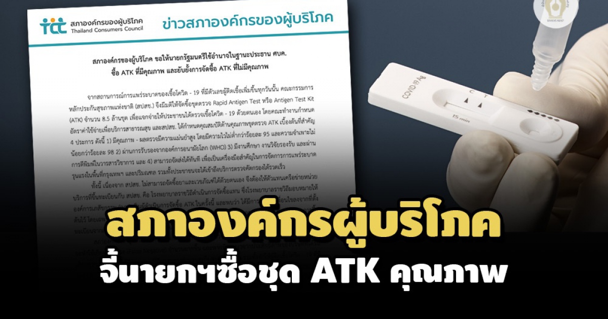 ผู้สื่อข่าวรายงานว่า เมื่อวันที่ 16 ส.ค.2564 สภาองค์กรผู้บริโภค ออกเอกสารเรียกร้องให้นายกรัฐมนตรี ใช้อำนาจในฐานะผู้อำนวยการศูนย์บริหารสถานการณ์แพร่ระบาดของโรคติดเชื้อไวรัสโควิด (ศบค.) จัดซื้อชุดตรวจ ATK (Antigen Test Kit) ที่มีคุณภาพ และยับยั้งการจัดซื้อเอทีเคที่ไม่มีคุณภาพ ระบุว่า