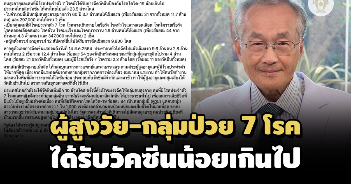 ผู้สื่อข่าวรายงานว่า เมื่อวันที่ 17 ส.ค.2564 นพ.มนูญ ลีเชวงวงศ์ แพทย์เฉพาะทางด้านโรคระบบการหายใจ โรงพยาบาลวิชัยยุทธ โพสต์ข้อความผ่านเฟซบุ๊ก หมอมนูญ ลีเชวงวงศ์ FC เปิดเผยว่า คนสูงอายุและคนที่มีโรคประจำตัว 7 โรคยังได้รับการฉีดวัคซีนป้องกันโรคโควิดน้อยเกินไป