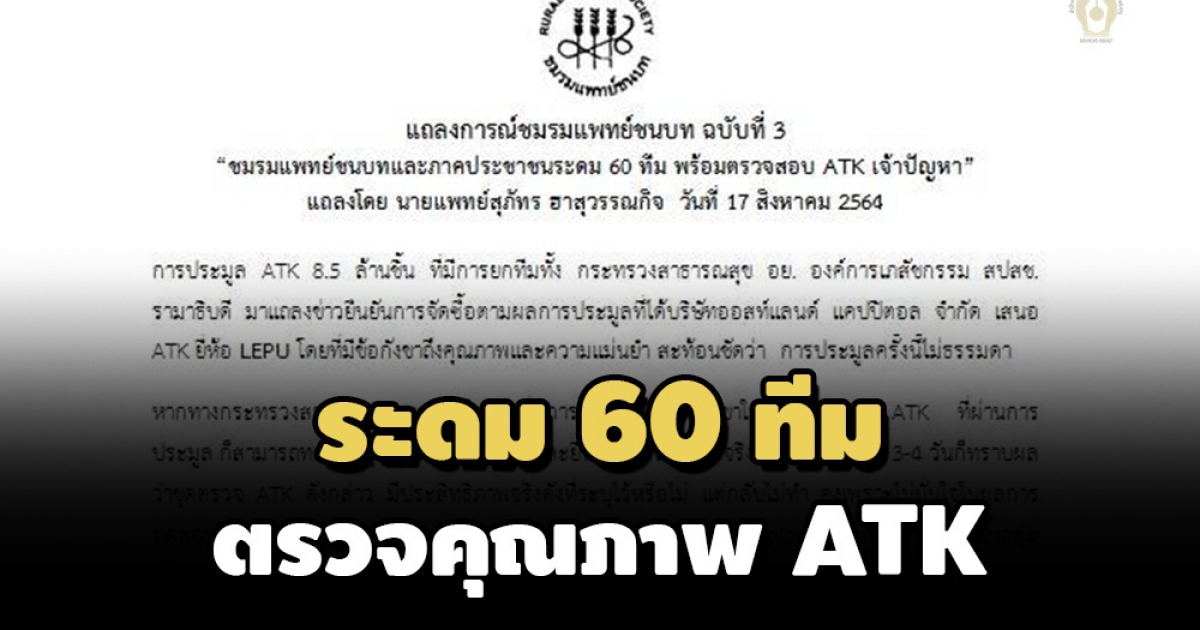 ผู้สื่อข่าวรายงานว่า เมื่อวันที่ 17 ส.ค.2564 ชมรมแพทย์ชนบท ออกแถลงการณ์ฉบับที่ 3 เรื่อง ชมรมแพทย์ชนบทและภาคประชาชนระดม 60 ทีม พร้อมตรวจสอบ ATK เจ้าปัญหา ผ่านเฟซบุ๊ก ชมรมแพทย์ชนบท ระบุว่า การประมูล ATK 8.5 ล้านชิ้น ที่มีการยกทีมทั้งกระทรวงสาธารณสุข สำนักงานคณะกรรมการอาหารและยา (อย.) องค์การเภสัชกรรม (อภ.) สำนักงานหลักประกัยสุขภาพแห่งชาติ (สปสช.) รามาธิบดี มาแถลงข่าวยืนยันการจัดซื้อตามผลการประมูลที่ได้ บริษัท ออสท์แลนด์ แคปปิตอล จำกัด เสนอ ATK ยี่ห้อ LEPU โดยที่มีข้อกังขาถึงคุณภาพและความแม่นยำ สะท้อนชัดว่า การประมูลครั้งนี้ไม่ธรรมดา