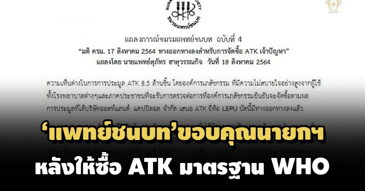 'แพทย์ชนบท' ออกแถลงการณ์ฉบับที่ 4 ชี้ทางออกสำหรับการจัดซื้อ ATK เจ้าปัญหา ขอบคุณนายกฯ หลังมีข้อสั่งการให้จัดหาชุดตรวจ ATK ที่ได้มาตรฐานสากล ได้รับการรับรองจาก อย. และต้องได้รับการรับรองจากองค์การอนามัยโลกแล้ว