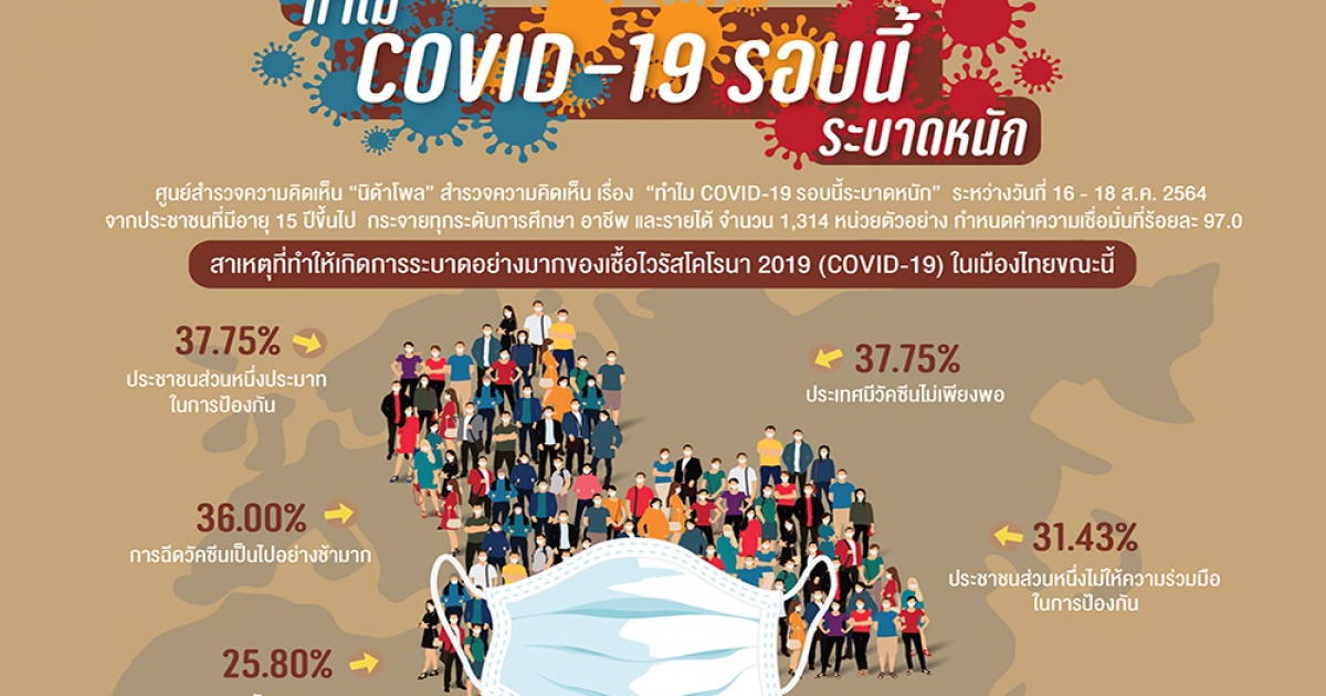 ศูนย์สำรวจความคิดเห็น “นิด้าโพล” สถาบันบัณฑิตพัฒนบริหารศาสตร์ (นิด้า) เปิดเผยผลสำรวจของประชาชน เรื่อง “ทำไม COVID-19 รอบนี้ระบาดหนัก” ทำการสำรวจระหว่างวันที่ 16 – 18 สิงหาคม 2564 จากประชาชนที่มีอายุ 15 ปีขึ้นไป กระจายทุกภูมิภาค ระดับการศึกษา และอาชีพทั่วประเทศ รวมทั้งสิ้น จำนวน 1,314 หน่วยตัวอย่าง เกี่ยวกับการระบาดของเชื้อไวรัสโคโรนา 2019 (COVID-19) ในเมืองไทยขณะนี้ การสำรวจอาศัยการสุ่มตัวอย่างโดยใช้ความน่าจะเป็นจากบัญชีรายชื่อฐานข้อมูลตัวอย่างหลัก (Master Sample) ของ “นิด้าโพล” สุ่มตัวอย่างด้วยวิธีแบบง่าย (Simple Random Sampling) เก็บข้อมูลด้วยวิธีการสัมภาษณ์ทางโทรศัพท์โดยกำหนดค่าความเชื่อมั่นที่ร้อยละ 97.0